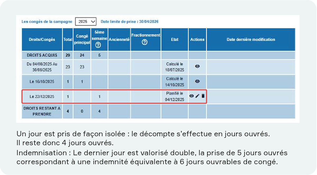 Si ces conditions sont réunies, les congés pris au cours de l’année 2025 sont indemnisés en 2025 et pris en compte dans les revenus 2025. Si le premier jour de congé est postérieur au 1er janvier 2026, et même si les dates ont été enregistrées avant fin 2025, le paiement des indemnités aura lieu courant janvier 2026, après l’intégration dans les systèmes d’information des taux de cotisations sociales entrant en vigueur au 1er janvier. Les congés pris à partir du 2 janvier 2026 sont indemnisés courant janvier et apparaissent sur la déclaration de revenus 2026.