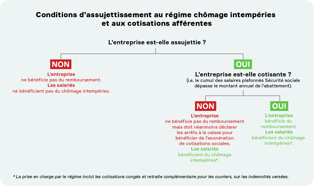 Attention : même non cotisante, en cas d’arrêt intempéries, toute entreprise assujettie est tenue au paiement des indemnités dues à son personnel ainsi qu’à la déclaration des arrêts auprès de la caisse. En effet, cette déclaration justifie l’exonération de charges sociales (URSSAF notamment) sur les indemnités versées et permet la prise en charge par le régime de chômage intempéries des cotisations congés et retraite complémentaire des ouvriers sur les indemnités versées.