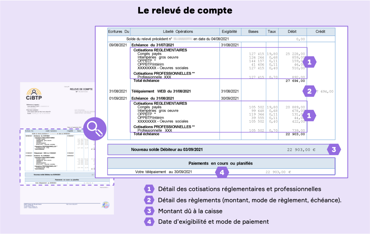 Chaque mois, après réception de la DSN, la caisse détermine la totalité des salaires, applique les bases, les taux, les règles spécifiques (abattement intempéries, par exemple) et établit un relevé de compte valant appel de cotisations. La mise à disposition de ce relevé sur l'Espace sécurisé CIBTP est notifiée à l'entreprise adhérente ainsi que, le cas échéant, à son tiers-déclarant.