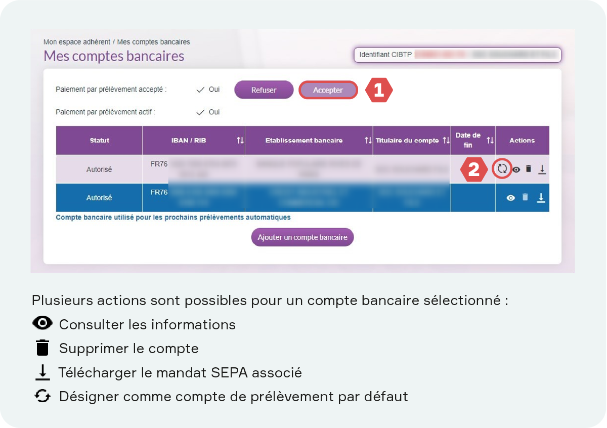 Mon espace adhérent > Mes comptes bancaires et cliquez sur Accepter(1) pour activer le prélèvement automatique. Le compte prélevé apparaît sur fond bleu.