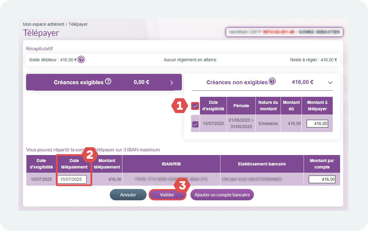 - Cliquez sur Valider(3) pour finaliser le télérèglement.