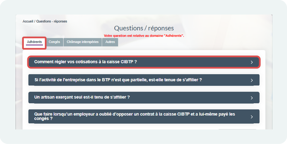 Ces coordonnées ainsi que l’ensemble des modes de paiement disponibles sont rappelées dans votre Espace sécurisé en suivant Questions/Réponses > onglet Adhérents. Consultez la question « Comment régler vos cotisations à la caisse CIBTP » .