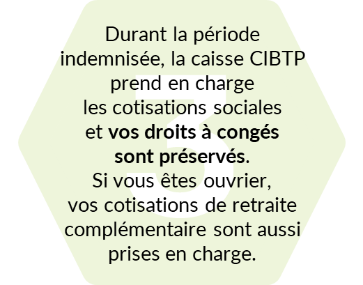 Durant la période indemnisée, la caisse CIBTP prend en charge les cotisations sociales et vos droits à congé sont préservés.